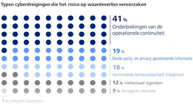 Het onderzoek neemt de verschillende soorten van misbruik van informatie door de verschillende cyberaanvallers als uitgangspunt. Zo blijkt dat een groot risico op waardeverlies (ruim 40 procent) voortkomt uit onderbrekingen van de operationele continuïteit. Dit is het gevolg van gerichte aanvallen door partijen die uit zijn op verstoring evenals een bijkomend gevolg van de breed-gerichte cybercriminaliteit. Dit raakt bijna alle organisaties.