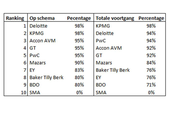 De lijst van negen accountantskantoren met een AFM-vergunning voor het mogen controleren van organisaties van openbaar belang (oob's) wordt aangevoerd door KPMG en Deloitte, die beide voor 98 procent op schema liggen met het invoeren van de afgesproken maatregelen. Ook het middelgrote kantoor Accon AVM scoort met 95 procent goed. Door het ontbreken van een partnerstructuur bij dit kantoor zijn diverse maatregelen rondom het organiseren van eigen intern toezicht niet van toepassing.