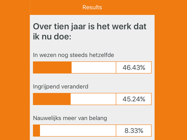 Bijna de helft van de accountants (46 procent) denkt dat zijn werk over tien jaar nauwelijks is veranderd. Nagenoeg hetzelfde aantal (45 procent) denkt juist dat de inhoud van het vak dan ingrijpend is gewijzigd, terwijl acht procent gelooft dat zijn werkzaamheden tegen die tijd nauwelijks meer van belang zijn.