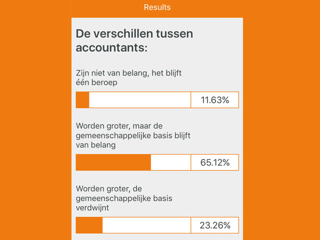 Bijna tweederde denkt dat de verschillen tussen de diverse ledengroepen van accountants groter worden, maar dat de gemeenschappelijke basis blijft bestaan. Iets minder dan een kwart voorziet dat die basis verdwijnt. Een reactie uit de zaal: "Ik hoop dat de gedeelde basis blijft bestaan, maar ik vrees dat het niet zal gebeuren."