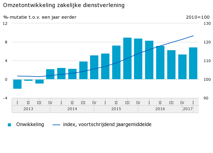 De omzet van de zakelijke dienstverleners steeg in het eerste kwartaal van 2017 met 6,9 procent. De omzetgroei in het eerste kwartaal van 2017 is sterker dan in de voorgaande twee kwartalen.