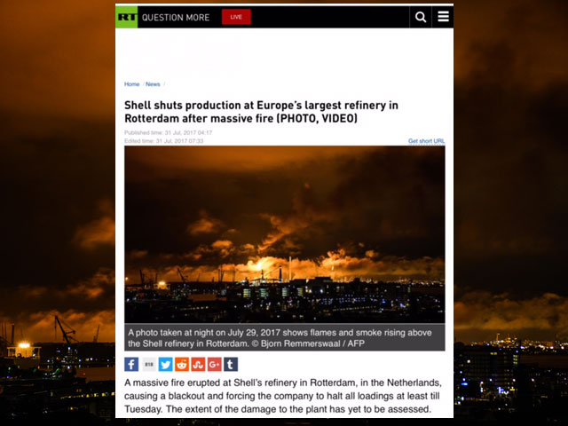 Onze redacteur Björn Remmerswaal maakte vanuit zijn appartement in Rotterdam een foto van dat proces. Via persbureau ANP ging zijn beeld vervolgens de wereld over: de foto werd niet alleen geplaatst op de voorpagina's van het AD en het FD (en daar ook op pagina 2-3), maar ook bij onder meer NRC, Nu.nl, The Guardian, The Wall Street Journal, Japan Times, Channel Asia en RT (Russia Today). Het stilvallen van Europa's grootste raffinaderij is immers wereldnieuws. De schade voor Shell zou per dag minstens 1 miljoen euro bedragen.
