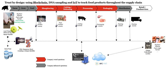 PwC en arc-net hebben gezamenlijk een blockchain-platform ontwikkeld waarbij gebruik wordt gemaakt van het unieke DNA-profiel van een dier, bijvoorbeeld een varken. Het DNA-profiel van elk varken in binnen een bepaalde keten wordt op het blockchain-platform geplaatst en daarmee wordt het varken 'gedigitaliseerd' (zie schema). Hiervoor wordt onder meer gebruik gemaakt van intelligente oorlabels, GPS tracking en tracing en vingerafdruktechnologie. Daarnaast worden de spelregels vastgelegd in een speciaal protocol en wordt er uitsluitend gebruikgemaakt van vooraf toegelaten partijen in de gehele keten.