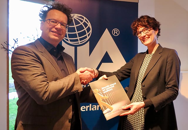 Edgar Karssing reikt het eerste exemplaar van het rapport uit aan Jantien Heimel, vice-voorzitter IIA Nederland.
