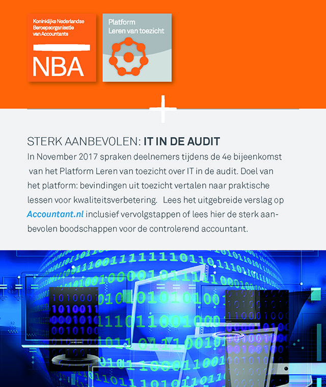 De factsheet presenteert op basis van het gesprek in het Platform naar aanleiding van die AFM-bevindingen tien aanbevelingen over effectieve inzet van IT in de audit en de samenwerking met IT-auditors. De NBA werkt in 2018 samen met betrokken partijen verder aan een handreiking 'Handen en voeten aan data-analyse bij de controle'.