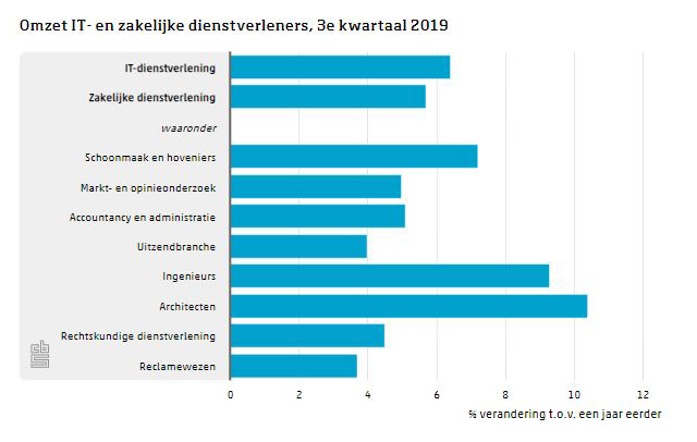 Nog steeds zet de zakelijke dienstverlening elk kwartaal meer om in vergelijking met een jaar eerder. Al vanaf 2013 is dat het geval. Het verschil tussen dezelfde kwartalen in twee opeenvolgende jaren wordt wel kleiner. In het eerste kwartaal van 2019 was dat nog 6,8 procent, in het derde kwartaal 5,7 procent.