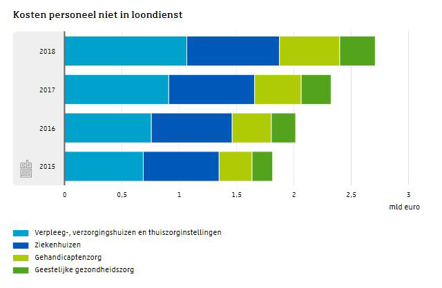 De totale bedrijfslasten van de vier grootste zorgsectoren namen in de periode 2015–2018 sterker toe dan de bedrijfsopbrengsten. Bijna drie kwart van de stijging van de bedrijfslasten in deze periode is toe te schrijven aan een toename van de personeelskosten. Niet alleen de kosten van het vaste personeel zijn toegenomen, maar vooral de uitgaven voor personeel dat niet in loondienst is, zoals uitzendkrachten, gedetacheerd personeel en zelfstandigen zonder personeel (zzp'ers). De kosten van het vaste personeel stegen tussen 2015 en 2018 met 9 procent tot 37,2 mld euro in 2018. De kosten van het ingehuurde personeel namen in dezelfde periode met 49 procent toe tot 2,7 mld euro in 2018.