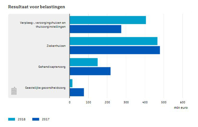In 2018 was het resultaat voor belastingen van drie van de vier grootste zorgsectoren lager dan in 2017, onder meer door de relatief sterke stijging van de kosten van de inhuur van personeel. In de geestelijke gezondheidszorg was de daling van het resultaat met 80 procent het grootst. Het resultaat van de geestelijke gezondheidszorg was hierdoor nog maar net positief. Het minst sterk was de daling bij de ziekenhuizen (3 procent).