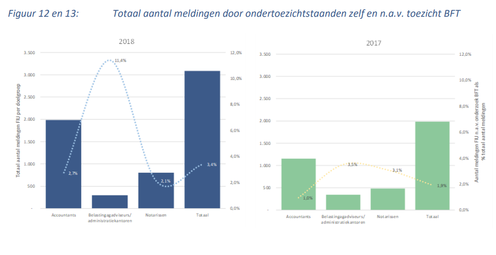 Volgens het BFT lijkt de stijging van het aantal meldingen van accountants deels veroorzaakt te worden door de invoering van de Implementatiewet vierde anti-witwasrichtlijn, waarin een nieuwe objectieve indicator is opgenomen. "Transacties die betrekking hebben op deze objectieve indicator - gedefinieerd als een transactie van of ten behoeve van een (rechts)persoon die woonachtig of gevestigd is of zijn zetel heeft in een staat die op grond van artikel 9 van de vierde Europese anti-witwasrichtlijn is aangewezen als een staat met een hoger risico op witwassen of financieren van terrorisme – komt frequenter voor bij cliënten van accountants(kantoren)."