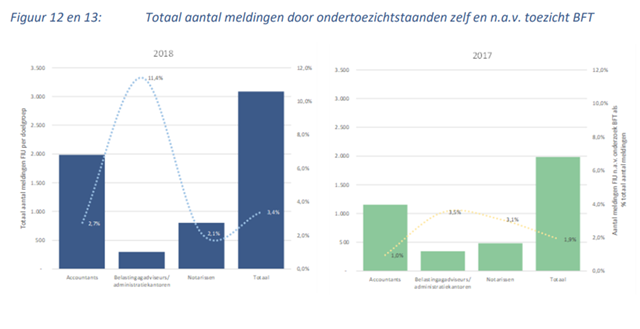 In 2018 hebben instellingen die onder toezicht staan van het Bureau Financieel Toezicht (BFT) in totaal 3.085 ongebruikelijke transacties gemeld bij FIU-Nederland. In 2017 waren dat er 1.983. Vooral accountants meldden veel meer transacties. Bijna tweederde van de meldingen in 2018 was afkomstig van accountants.