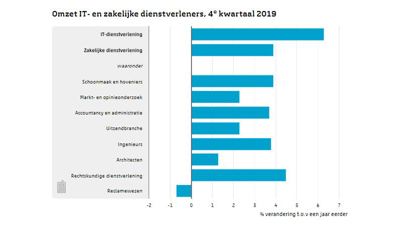De omzet van de zakelijke dienstverlening lag in het vierde kwartaal van 2019 3,9 procent hoger dan in hetzelfde kwartaal een jaar eerder. Over heel 2019 was de omzet 5,6 procent hoger. Een jaar eerder steeg de omzet nog met 8,1 procent.