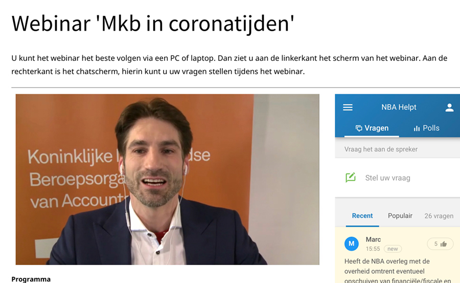 Het laatste deel van het webinar ging in op de vragen die tijdens de bijdragen van de sprekers door deelnemers werden gesteld. Veel van die vragen gingen over de nieuwe NOW-regeling en de verklaring van de accountant die daar straks bij wordt gevraagd. Het webinar ‘Mkb in coronatijden’ is terug te kijken via nba.nl/webinar.