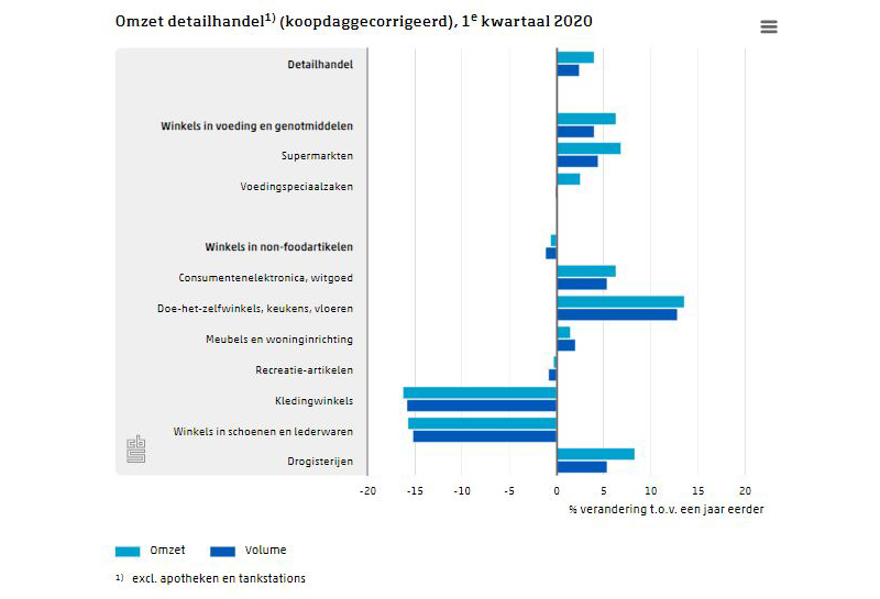 De omzet van de detailhandel was in het eerste kwartaal van 2020 4 procent hoger dan een jaar eerder. De eerste coronamaatregelen zorgden aan het eind van het eerste kwartaal (in maart) voor grote omzetschommelingen in diverse detailhandelsbranches.
