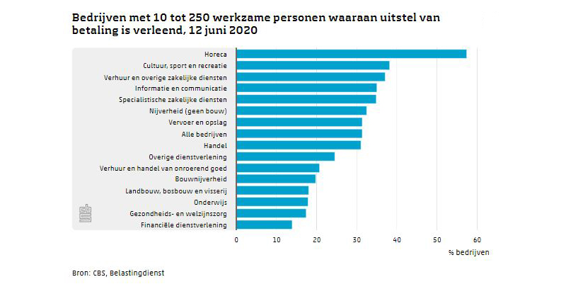 Van 1 april tot en met 12 juni verleende de Belastingdienst vanwege de coronacrisis aan 128 duizend bedrijven drie maanden uitstel van betaling voor de inkomstenbelasting, Zorgverzekeringswet, vennootschapsbelasting, loonheffingen en omzetbelasting (btw). Dit is 7 procent van alle bedrijven. Dit relatief lage percentage komt doordat ruim drie kwart van alle bedrijven 1 werkzame persoon heeft en daarvan heeft minder dan 5 procent uitstel aangevraagd.