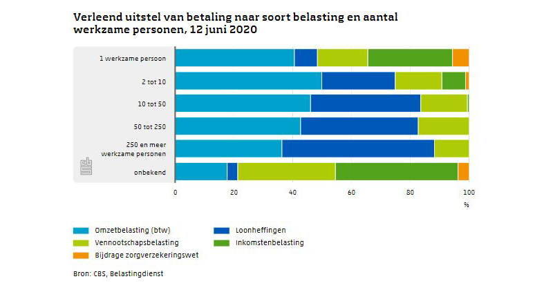 Bedrijven met minder dan 10 werkzame personen vroegen en kregen vooral uitstel van betaling voor omzetbelasting (btw), en bedrijven met 10 of meer vooral uitstel van de loonheffingen. Van de 9,8 miljard euro waarvoor de Belastingdienst tot en met 12 juni uitstel van betaling verleende, was 3,5 miljard euro bij bedrijven met 250 of meer werkzame personen en 0,7 miljard euro bij bedrijven met 1 werkzame persoon.