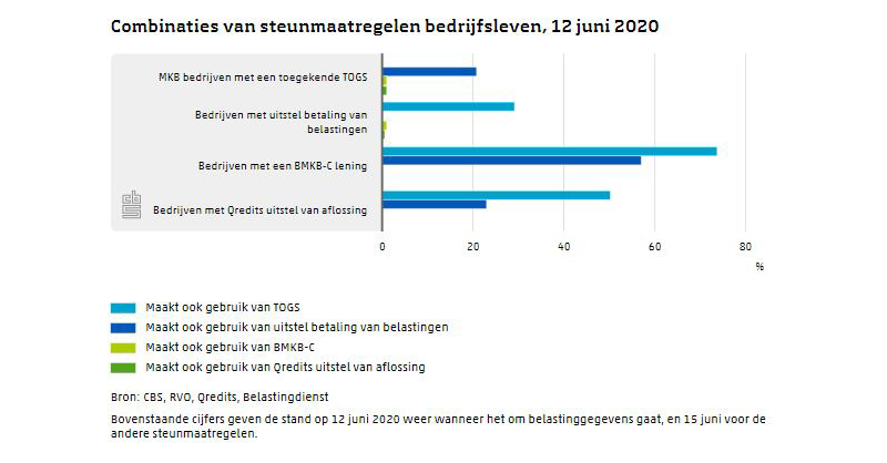 Van de bedrijven waaraan tot en met 15 juni een lening en garantie in het kader van de Borgstelling MKB-kredieten (BMKB-C) was verleend, had 57 procent eveneens uitstel van het betalen van belasting gekregen. Bij de bedrijven met uitstel van aflossing bij Qredits ging het om bijna een kwart.