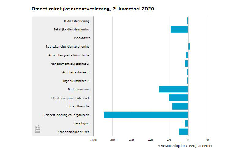 De omzet van de zakelijke dienstverlening was in het tweede kwartaal van 2020 18,5 procent lager dan in hetzelfde kwartaal een jaar eerder. Vooral in de reclame- en de reisbranche vielen door de coronacrisis harde klappen. De administratieve dienstverlening boekte 1,9 procent minder omzet, de eerste daling in vijf jaar.