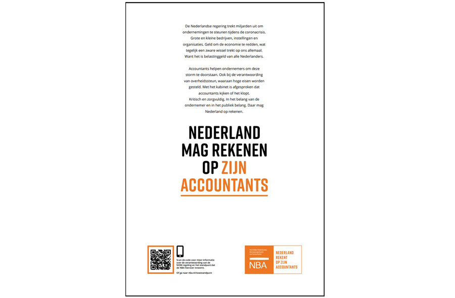 Aan de verantwoording van de overheidssteun worden "hoge eisen gesteld", aldus de NBA in de advertentie. "Met het kabinet is afgesproken dat accountants kijken of het klopt" en dat moet kritisch en zorgvuldig. "In het belang van de ondernemer en in het publiek belang."