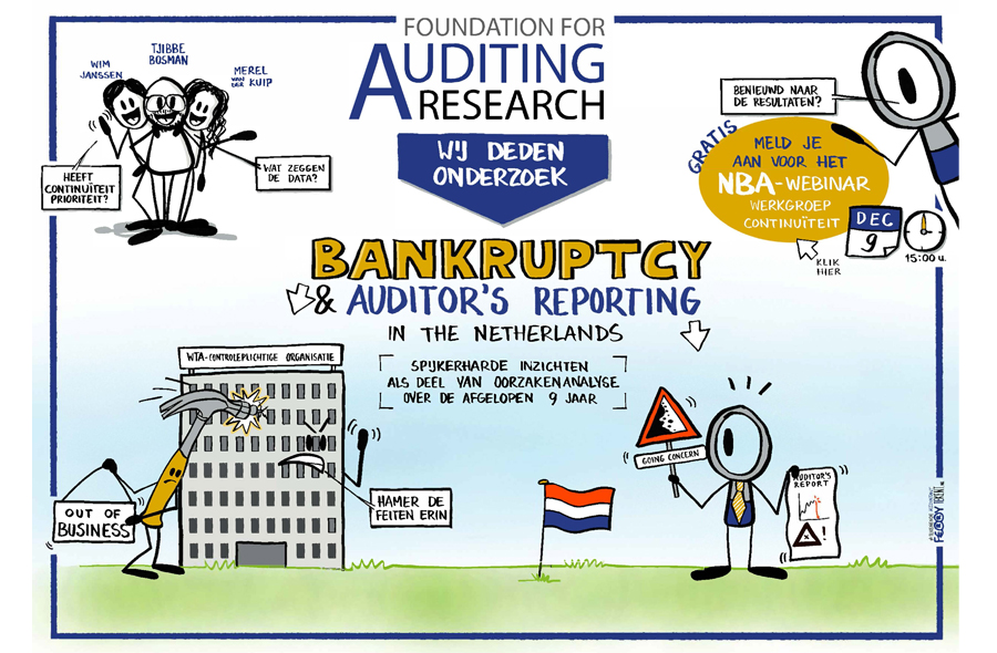 Tijdens het webinar maakt de werkgroep "tussentijds de balans op". De werkgroep deelt de resultaten van de verschillende onderdelen van het uitgevoerde onderzoek, waaronder data-analyse door de Foundation for Auditing Research (FAR) naar faillissementen in Nederland tussen 2012 en 2020, inzichten in wetenschappelijke publicaties met betrekking tot het onderwerp 'continuïteit en accountant' en een oorzaakanalyse naar de factoren die een rol spelen bij het tijdig en adequaat signaleren van continuïteits-vraagstukken in een onderneming.
