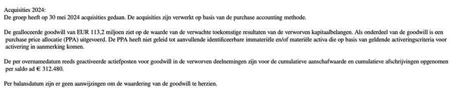 Blijkens het kasstroomoverzicht van de nieuwe topholding is voor € 79,3 miljoen aan nieuwe aandelen uitgegeven. Voor € 41 miljoen is aan bankkredieten aangetrokken, om de overname te financieren. Opgeteld komt dat neer op een oorlogskas van € 120,3 miljoen, die uitsluitend is gebruikt voor de overname van de aandelen van Q-concepts Beheer BV, de vroegere holdingvennootschap. De als gevolg van de overname opgenomen goodwillpost in QTopCo Coöperatief UA bedraagt € 113,2 miljoen, per balansdatum.