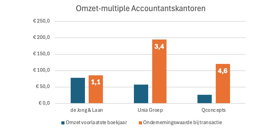 Omzet-multiples van de kantoren de Jong & Laan (2022), Unia Groep (2024) en Qconcepts (2024)