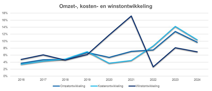 De gemiddelde winstgroei bij de deelnemende kantoren daalde in 2024 met een procent ten opzichte van 2023, toen de winstgroei nog gemiddeld 8 procent was. De daling wordt onder meer veroorzaakt door een stijging van de gemiddelde kosten met 10,4 procent, aldus de benchmark. De gemiddelde personele lasten (+12,8 procent) en de ICT-kosten (+11 procent) stegen het meest.