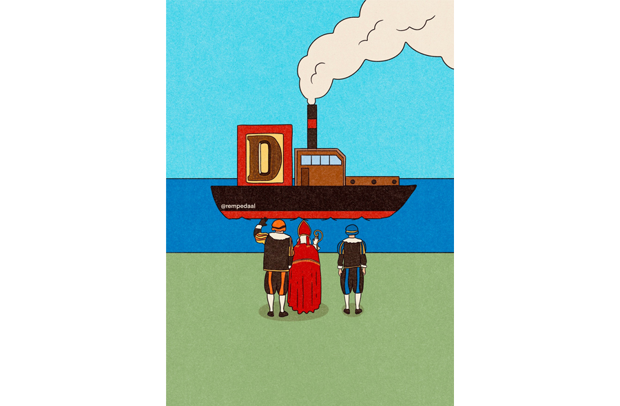 "Meteen nadat ik het verdrietige nieuws over Dieuwertje hoorde, kwam er een illustratie in mij op, van Sint en twee Pieten, die aan de waterkant naar de stoomboot zwaaien, waarop een grote chocoladeletter D staat", zo meldt Björn op LinkedIn.