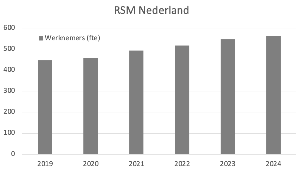 RSM telde in boekjaar 2024 in ons land 562 werknemers, per saldo 16 fte meer dan een jaar eerder. Daarvan is grofweg de helft accountant en een kwart belastingadviseur. De ondersteunende staf is goed voor een achtste en nog eens een achtste wordt door RSM geschaard onder 'overige dienstverlening'.