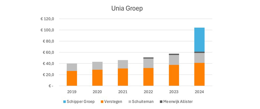 Omzet (pro forma) Unia Groep 2019-2024 (in miljoenen €). De omzetgegevens van Schuiteman en Meerwijk Allister zijn ramingen op basis van eerdere jaren.