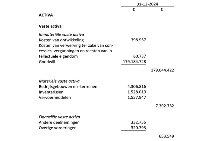 Naast de initiële goodwill van € 186,5 miljoen is er nog eens € 7,3 miljoen betaald voor de materiële vaste activa en bovendien € 0,6 miljoen voor de financiële vaste activa van de drie fusiekantoren. Onvermeld in de jaarrekening is welke debiteuren bij de transacties zijn meegenomen, welke schulden zijn verrekend en welke kasposities verworven. Met dat voorbehoud komt een voorzichtige raming van de ondernemingswaarde neer op € 194,4 miljoen.