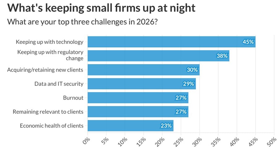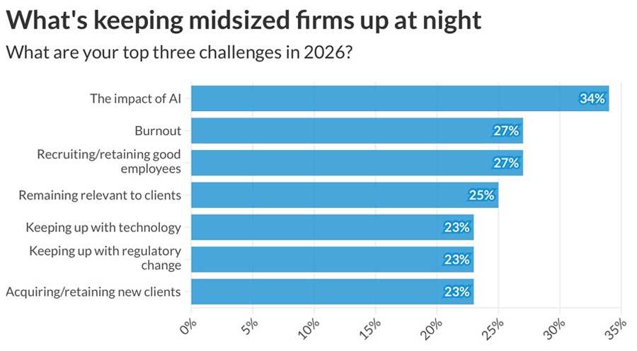 De vaktitel Accounting Today vroeg de beslissers van kleine, middelgrote en grote accountantskantoren om de zaken waarvan zij wakker liggen te rangschikken. Onder de titel The Year Ahead in Numbers peilden zij zo de grootste uitdagingen van kleine, middelgrote en grote accountantskantoren. De verschillen in de resultaten tussen de kantoren waren opvallend.