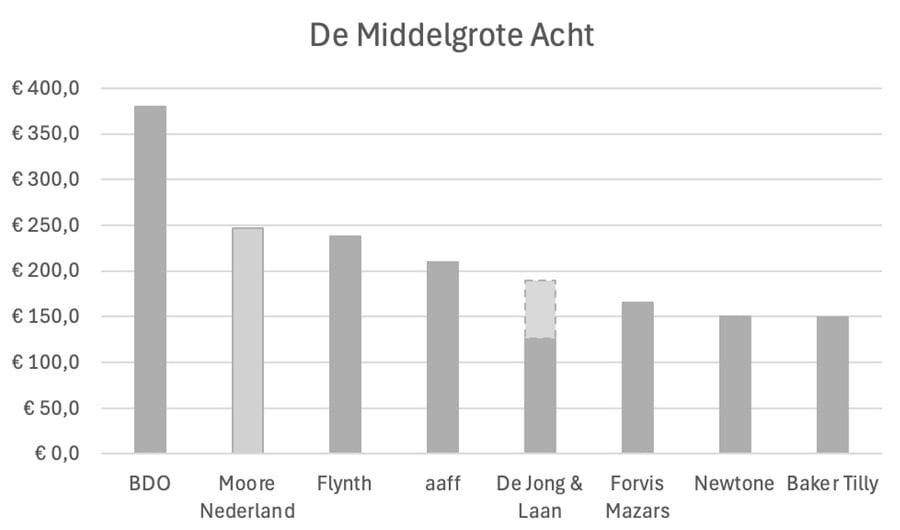 De nummers 4 tot en met 12 na de fusie van Moore DRV en Moore MKW, gerangschikt in omzet in boekjaar 2024, in miljoenen euro’s.