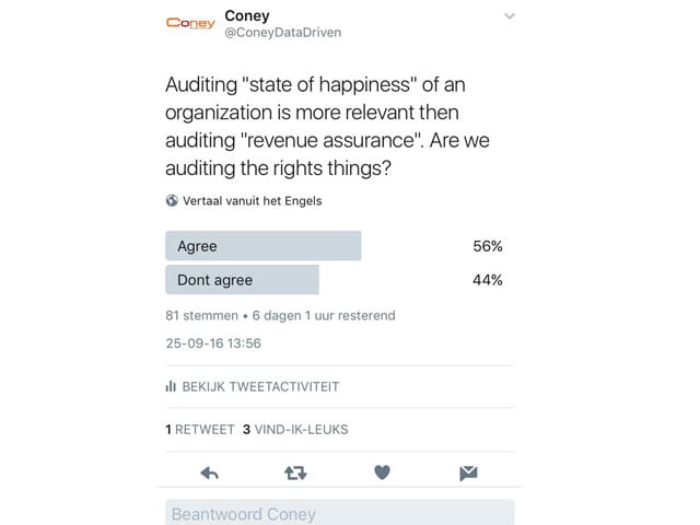 Prima, maar nu ik 'om ben' wil ik daar natuurlijk niet op wachten. Vanaf morgen ga ik de geluksfactor van mijn klanten controleren! Het leuke is: ik heb op twitter al een klein polletje uitgezet en wat schetst mijn verbazing?
