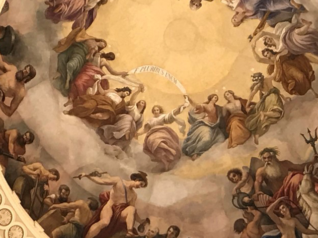 Begin december bezocht ik het Capitool in Washington DC. Het bezoek was mijn einddoel van een reis door de vijftig staten van Amerika. DC staat voor District of Columbia - dus geen staat op zichzelf zoals de andere vijftig - en is in het leven geroepen toen men na de burgeroorlog maar niet kon besluiten welke stad de hoofdstad van de Verenigde Staten zou worden. DC werd gevestigd op neutraal terrein. In de rotunda van het Capitool staat hoog op het plafond geschilderd 'E pluribus unum' oftewel 'Uit allen één'. Ooit het officieuze motto van de Verenigde Staten, later vervangen door 'In God we trust'.