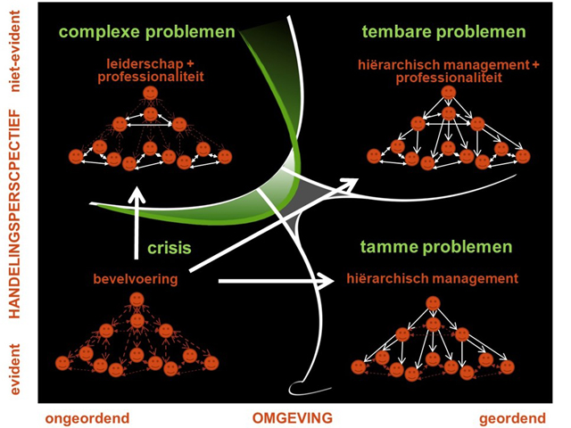 In De uitdagingen van besturen in de zorg schrijft René Wijers: "In tijden van verandering en onzekerheid is er dikwijls een roep om 'krachtig' leiderschap, maar dat is geen adequate reflex bij wicked problems. Het model van gedistribueerd en collectief leiderschap lijkt het beste aan te sluiten bij de context van een complexe informatiesamenleving." In navolging van Dave Snowden onderscheid ik verschillende omgevingsafhankelijke soorten problemen: tamme, tembare en complexe. Onopgeloste problemen resulteren op den duur in een crisis. Om uit een crisis te komen moet iemand een rol nemen (en krijgen) als bevelvoerder. Desnoods aangesteld door de politiek.
