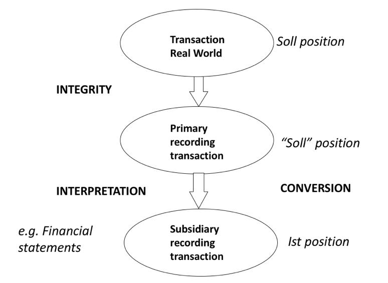Het transactiemodel (zie figuur) laat zien hoe de transacties in de echte wereld leiden tot gegevens en die gegevens weer tot informatie.