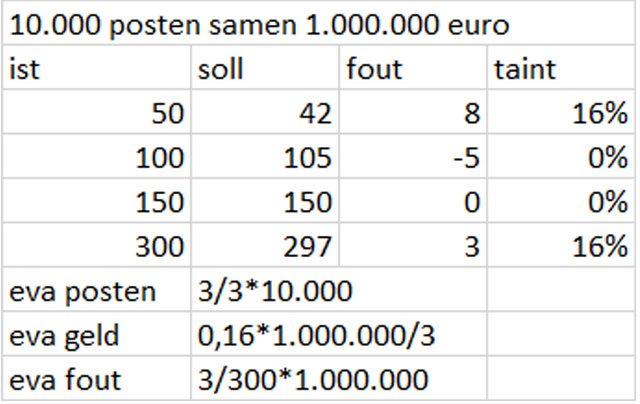 Ik onderstreep deze foute manier van evalueren met nog een getallenvoorbeeld: de populatie van 10.000 posten is samen 1.000.000 waard. Een steekproef van 3 geeft: