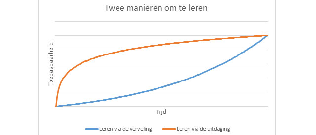 Onderstaande figuur, die gebaseerd is op het ongepubliceerde gedachtegoed van Koos Ris, maakt dit duidelijk. Op de horizontale as staat de bestede tijd aan een statistische module. Op de verticale as staat de toepasbaarheid van het geleerde. De onderste curve toont het 'leren via de verveling' in de eerste kwantitatieve modules van een accountancyopleiding. Pas als er een theoretische fundament enigszins gevormd is, kan de student beginnen met toepassingen in de accountancypraktijk.
