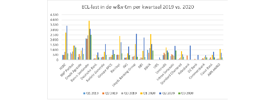 De piek in de ECL-last voor ING Bank is te zien in het tweede kwartaal van 2020; voor ABN Amro Bank is dit in het eerste kwartaal van 2020. Rabobank publiceert geen cijfers over het eerste en derde kwartaal. ABN AMRO Bank verantwoordt €1,1 miljard ECL in het eerste kwartaal 2020, tegenover €102 miljoen aan ECL in het eerste kwartaal 2019. ING Bank verantwoordt €1,3 miljard ECL in het tweede kwartaal 2020, tegenover €209 miljoen aan ECL in het tweede kwartaal 2019. Rabobank verantwoordt € 1,4 miljard ECL in de eerste zes manden van 2020, tegenover € 440 miljoen aan ECL in de eerste zes manden van 2019. Engelse banken vertonen een zelfde lijn. HSBC verantwoordt € 3,4 miljard ECL-last in het tweede kwartaal 2020, tegenover € 488 miljoen aan ECL-last in het tweede kwartaal 2019. Lloyds Banking Group verantwoordt € 1,6 miljard ECL-last in het tweede kwartaal 2020, tegenover € 339 miljoen aan ECL-last in het tweede kwartaal 2019.