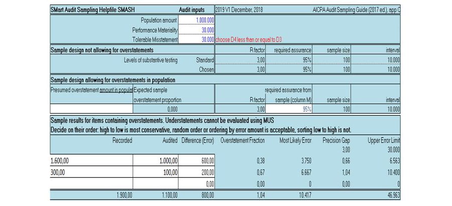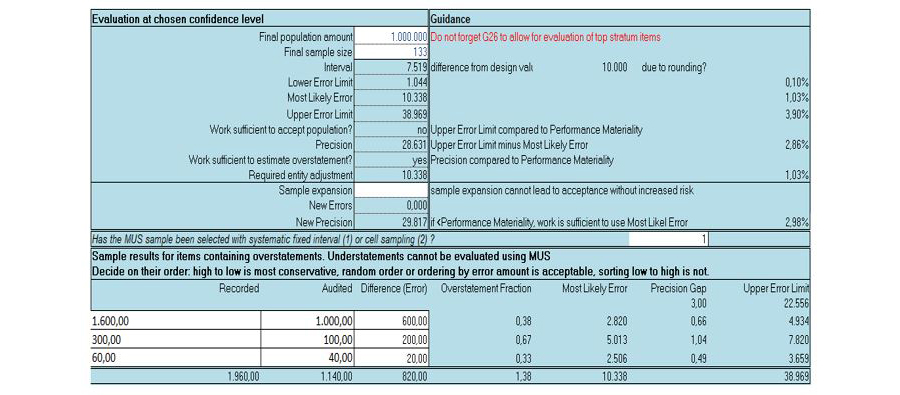 Een voorraadwaarde van 1.000.000 euro wordt gecontroleerd met een uitvoeringsmaterialiteit van 30.000 euro en 95 procent betrouwbaarheid. Als geen fouten worden verwacht (de aanvrager heeft immers aangegeven juist en volledig te hebben aangeleverd) en toegestaan, is een MUS geldsteekproef van 100 nodig waarin geen fouten mogen voorkomen.