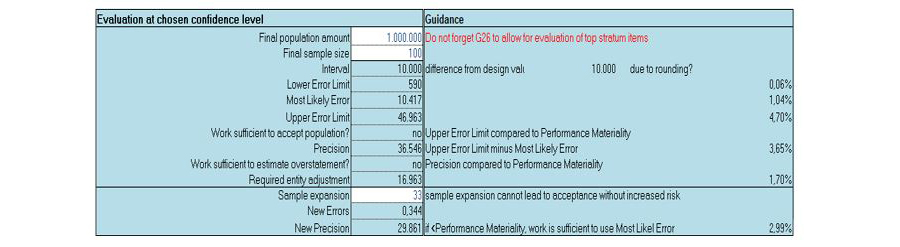 Als er twee fouten worden gevonden rekenen we de foutfracties uit om tot een geprojecteerde en een maximale fout te komen. De maximale fout ligt boven de uitvoeringsmaterialiteit, en dat is ook zo na correctie van de geprojecteerde fout. De steekproefomvang moet dus worden opgehoogd om een betere schatting te leveren: