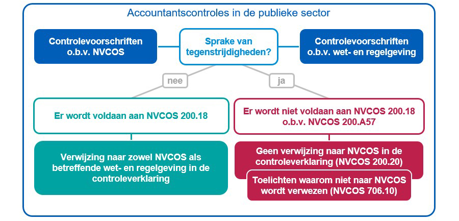 De lezer zal zich nu wel afvragen: hoezo 'in principe' niet toegestaan? Dat leg ik zo uit. Het is duidelijk dat een accountant een controle in overeenstemming met de NV COS dient uit te voeren en aan alle relevante standaarden moet voldoen (bestuursbesluit NV COS en NV COS 200.18). Wat in dit kader bijzonder is, is de bepaling van NV COS 200.A57. Deze standaard bepaalt dat controlevoorschriften opgelegd door wet- en regelgeving af kunnen wijken van de voorschriften van de NV COS. Dat sluit ook aan op de bedoeling van de NV COS om geen afbreuk te doen aan specifieke wet- en regelgeving die de controle van financiële overzichten regelt.