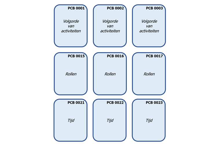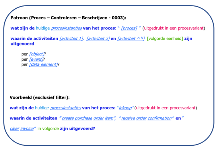 In figuur 3 staat het analysevraagpatroon: proces – controleren – beschrijven (0003) weergegeven. Aan de bovenkant van de ‘kaart’ staat het patroon van de analysevraag en aan de onderkant wordt een voorbeeld weergegeven van een specifiek ingevulde vraag. In dit geval wordt als voorbeeld het inkoopproces gegeven waarin de volgorde van drie activiteiten wordt gecontroleerd (‘create purchase order item’ en ‘receive order confirmation’). Op basis van het patroon kunnen vragen specifiek voor de controleopdracht worden geformuleerd. Als hulpmiddel daarbij wordt het patroon in onderstaande ‘kaart’ (figuur 4) weergegeven, maar dan zonder de elementen die zelf bepaald kunnen worden. Een aantal andere voorbeeldvragen zou kunnen zijn: