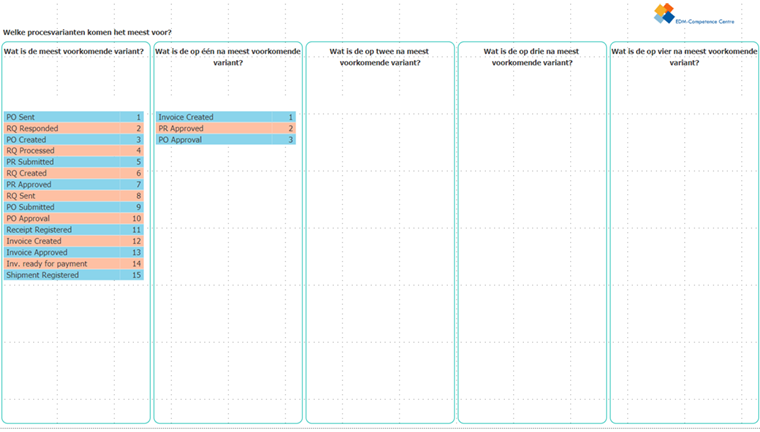 Door deze koppeling wordt het ‘requirements’ proces van data-analyse een stuk eenvoudiger gemaakt. Laten we dit door middel van het analysevraagpatroon PCB – 0003 kort illustreren. De data-elementen benodigd om deze vraag te kunnen beantwoorden zijn: Case-ID (uniek identificatienummer van een factuur), een datum plus tijdstempel en de activiteit zelf.