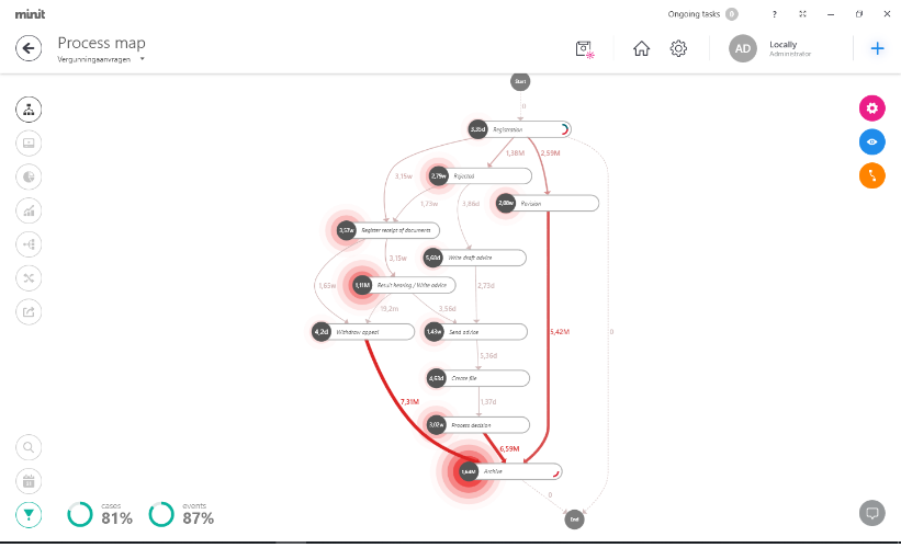 Daarnaast dient het antwoord op de vraag te worden gevisualiseerd. In dit specifieke geval bestaan er vele manieren van visualiseren die in de verschillende tools anders zijn. In figuur 5 en 6 zijn twee verschillende voorbeelden gegeven. De eerste visualisatie (figuur 5) komt uit DAOS en de tweede visualisatie uit het softwarepakket Minit (figuur 6).