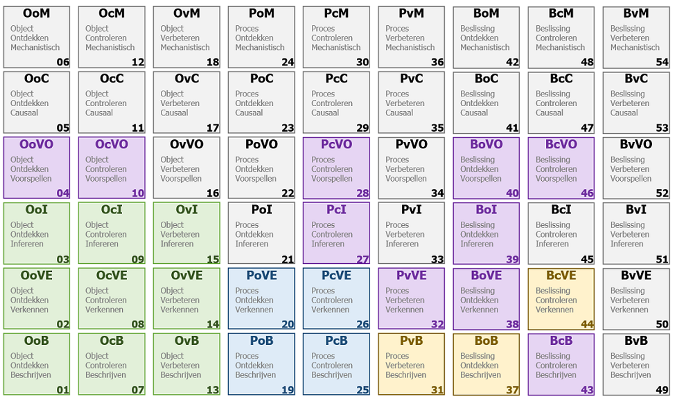 Voor het opstellen van een dergelijk model kun je gebruik maken van een periodiek systeem van het VTA-model (zie figuur 7). In het onderstaande model betekent grijs dat een accountantsorganisatie de analyse niet kan uitvoeren, groen dat het standaard is binnen elke controle en iedereen het kan uitvoeren, blauw dat het binnen elke controle wordt toegepast, maar er echte expertise nodig is. Geel betekent dat het niet binnen elke controle wordt uitgevoerd. Door deze scores te bepalen voor elk type, kun je een gedegen strategie inzetten van waar en hoe je moet gaan verbeteren.