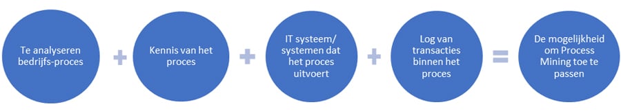 | Kennis van het proces | Om de resultaten van process mining goed te kunnen interpreteren, is het wenselijk dat een expert van het proces betrokken is. Hierdoor kunt u de verbetermogelijkheden beter signaleren en prioriteren. De proces-expert kan u ook helpen om deze verbeteringen daadwerkelijk te implementeren. |