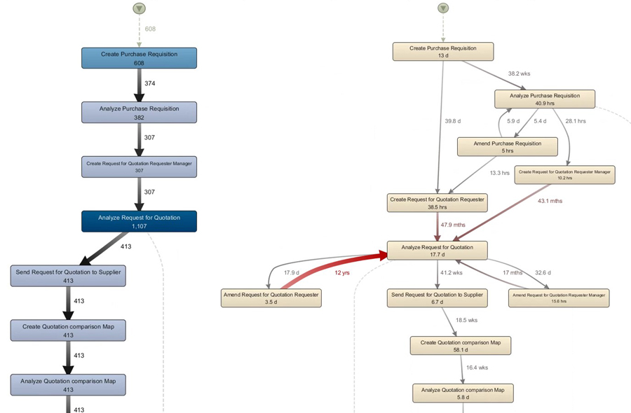 Na het inlezen van deze data zal de software het proces analyseren aan de hand van diverse algoritmes. Vervolgens geeft de software het werkelijk verlopen proces (IST) visueel weer. Aan de hand van deze visualisatie kunt u het proces verder analyseren. Alle onderliggende data over een bepaalde periode zijn bij deze visualisatie ook beschikbaar. Hierdoor kunt u top-down van het hoogste tot het laagste niveau de opeenvolging van handelingen binnen het proces analyseren. Maar ook kunt u bijvoorbeeld doorlooptijden, herstelacties, first-time-right, KPI's en andere relevante aspecten van het proces onderzoeken.