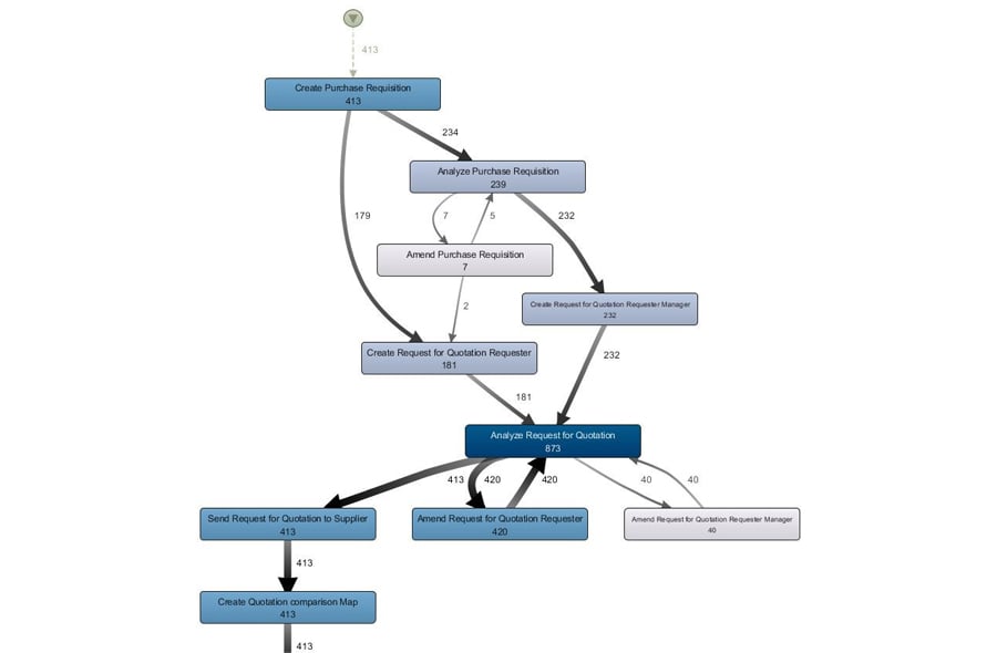 Figuur 5 schetst het procesverloop van het signaleren van de behoefte aan een offerte tot de ontvangst van de offerte. Voor de interpretatie van figuur 5 is het belangrijk om te weten dat hoe breder een pijl is, hoe meer transacties dit proces-pad doorlopen hebben. Je zou bij dit proces verwachten dat er alleen rechtstreekse lijnen zouden zijn, dus zonder uitzonderingen en zogenoemde loopings. Desondanks blijken er in dit proces veel uitzonderingen en procesvarianten te zijn. Deze varianten zijn de aanknopingspunten voor procesverbetering.