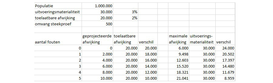 Een steekproef van 1 waarneming met 0 afwijkingen geeft een geprojecteerde afwijking van 0 procent, en dan is het verschil met de toelaatbare afwijking 2 procent en met de uitvoeringsmaterialiteit 3 procent. Ruim voldoende, dus…? Een steekproef opzetten met behulp van een eis aan de geprojecteerde afwijking kan niet, want dat levert altijd een noodzakelijke omvang op van 1.